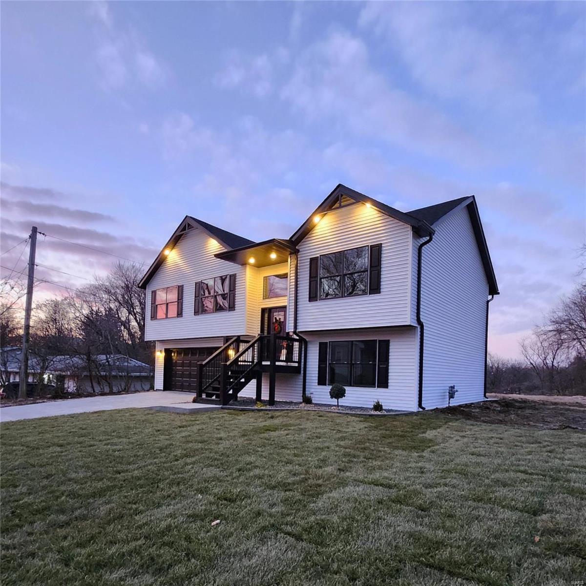 OPEN HOUSE SATURDAY JAN 18th ~ Significant Price Reduction on this New Construction Home ~ 4 bed & 3 bath ~ approx. 2,000 square feet ~ Oversized 2 car garage. Large lot just under half an acre. Freshly sodded & landscaped front yard. Gorgeous exterior combo of white vinyl siding with black highlights & black trimmed windows. Stamped concrete driveway & patio. Large covered front porch with black railing. Open Floor Plan. Custom window & lighting accent the bright entry foyer. LVP flooring. Kitchen featuring custom white cabinets, center island, solid counters. New Refrigerator, Range/Stove, Dishwasher & Built in Microwave included. Vaulted ceilings. This home features a Living room AND a Family room. Primary Bedroom Suite with walk in closet and private 3/4 bath with double sink. Walk out lower level with full size look out windows. The builder is finishing up on the final items including smoothing and grading the back & side yards. 30 min to Scott AFB. 20 min to downtown STL.