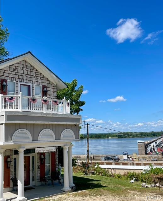 Charming Riverfront Property in Historic Clarksville! Welcome to Port Reclamation- a one-of-a-kind retreat above Lock & Dam 24 amid the bluffs. This beautifully designed two-story building features classic architectural details and a spacious upper balcony offering breathtaking panoramic river views, has been a very successful short-term rental. Property being sold FURNISHED! High vaulted ceilings and large windows bring in natural light. Fireplace and decorative mantel center the room and anchor the living space. A nook perfect for breakfast with a view. Kitchen features white cabinets and island stove. The upper level is a second bedroom with plenty of room to spread out and relax. Save big on electric Solar panels installed less than two years ago. Enjoy watching the river traffic and eagles soar from your private outdoor spaces. Rail enthusiasts will love the trains that run through town daily. Don't miss your opportunity to become a part of this historic Mississippi River town.