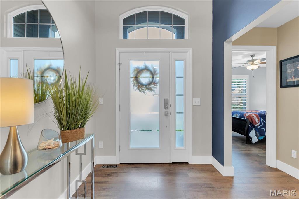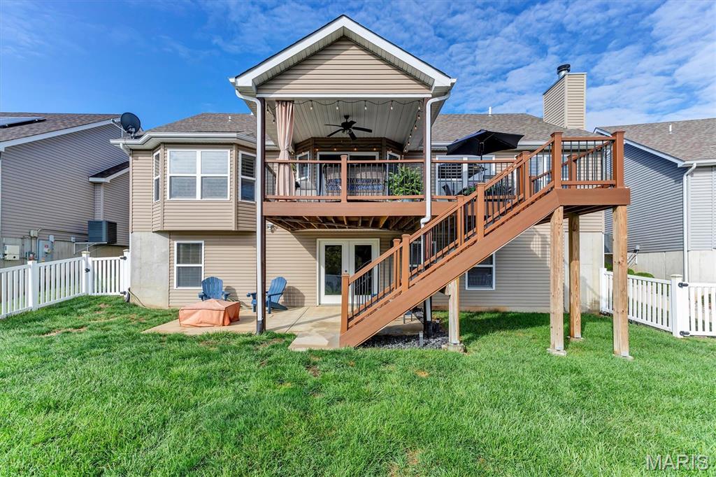 Welcome to this gorgeous ranch home located in Amberleigh Woods subdivsion in Seckman schools! Beginning with the exterior, you will love the brick front with 3 car garage, trendy front door with sidelight, fenced yard (property line goes beyond fencing), expansive composite deck with half being covered, along with stairs to yard, patio, and gorgeous views. Once inside, you will notice the open floor plan with vaulted ceiling, plenty of recessed lighting, plantation shutters throughout, 5" baseboards, and ceiling fans in all of the rooms. In the kitchen there is an abundance of 42" cabinetry with crown, granite countertops, huge breakfast bar, gourmet gas range, and so much counterspace. The primary suite is vaulted with walk-in closet and dual vanity in bath. For your convenience, there is also a main floor laundry. Amberleigh Woods a desired neighborhood to live and includes a subdivision pool and clubhouse. This fabulous home is a MUST SEE!