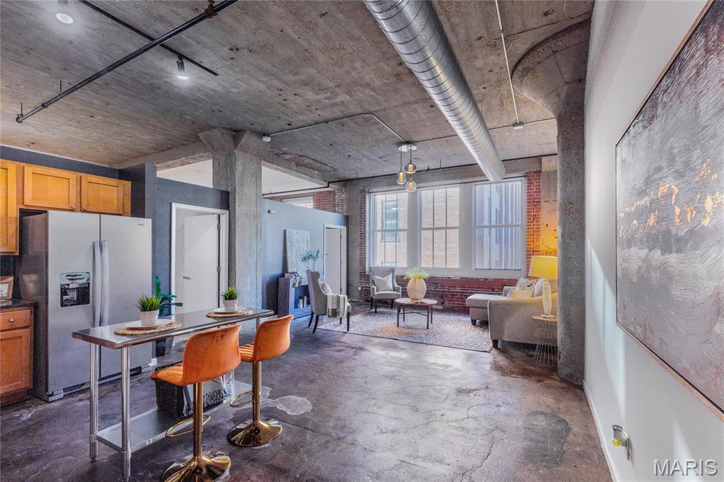 Don't miss this fabulous roomy Annex Lofts Condo in the downtown loft district on Locust! Unique to this awesome space are TWO deeded & secure garage parking spaces! 2 large bedrooms & 2 full baths plus in-unit laundry makes this home sweet home, the perfect abode. Fresh neutral paint throughout with updated lighting! New stainless kitchen appliances plus new washer and dryer as well. Polished concrete floors throughout with ceramic tile in the bathrooms and neutral carpeting in both bedrooms. Granite countertops and maple custom cabinets in the generously sized kitchen will give that resident chef plenty of working and entertaining space! Exposed brick walls and soaring 12 foot ceilings bring that true loft ambiance into play perfectly! Tons of common area amenities throughout the property including a fully equipped gym with top of the line machines & flat screen tv's! You have extra locking storage on the lower level with an extra space to store your urban commuter bicycles as well! A lounge area/community room with pool tables, flat screens, sofas and chairs plus a private 1/2 bath gives you & your guests entertaining or relaxing space outside your own personal condo! Walk outside the community room and you'll find a place to relax or fire up the grill after your busy work schedule concludes. Two main building elevators and a garage elevator make your entrance & exit no hassle, safe & secure. All new appliances! Flowing rooms & a large primary ensuite with walk-in closet sets the stage for your move-in ready city oasis! Downtown living in "The Lou" with none of the parking hassles and great walkability! Your space at The Annex Lofts is waiting for you!