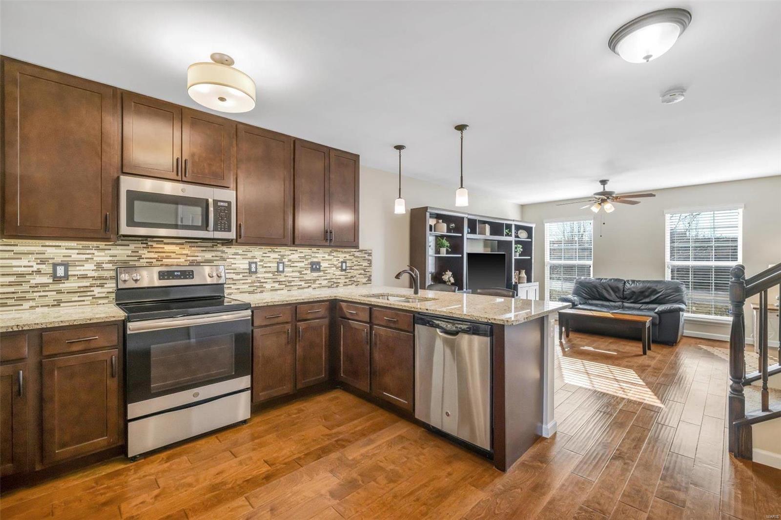 Beautiful 1900 sq. ft. townhouse with open floor plan located in sought after Maryland Heights and Parkway Schools. The home features 2(3) bedrooms, 3.5 baths, one car attached garage and a finished lower level with a full bath. Some upgrades include wood floors, a modern kitchen featuring granite countertops, backsplash, stainless appliances, upgraded cabinets, under-cabinet lighting and breakfast bar. The separate dining area opens to a private patio. The spacious family room is perfect for entertaining. Upstairs leads to 2 large bedrooms with walk-in closets, 2 baths (1 in MB). An open, versatile upstairs loft area could be an office, TV area or rec room. Make it your own. The finished lower level with a full bath and egress window offers many options including a bedroom (add a closet) in-law suite, family room, recreation room, office or gym. Your imagination is the key for the LL. This home offers unlimited opportunities and flexibility. Fabulous location near Westport. Location: Lower Level, Upper Level