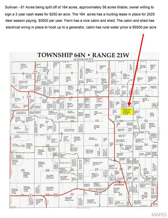 81 ac Sullivan County being split off of 165 ac, approximately 58 ac tillable owner willing to sign a 3-year lease for $250 an acre. The 165 ac has a hunting lease in place for 2025 deer season paying $5500 per year. Farm has a nice cabin & shed. The cabin and shed has electrical wiring in place to hook up to a generator, cabin has rural water. Priced at $5500 per acre