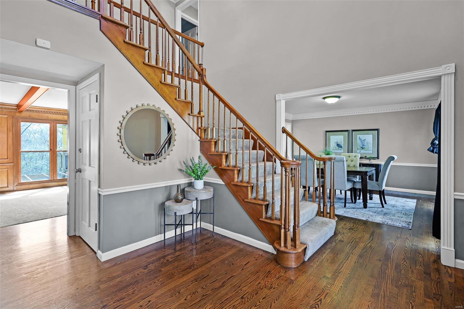 Open Canceled 4/6/25 - Welcome to 2728 Sun Meadow Dr, a picturesque Tudor-style retreat in the heart of Wildwood. This 5-bed, 3-bath home sits on nearly half an acre, offering a perfect blend of character and modern luxury. Step into the grand two-story foyer, where natural light pours in, highlighting rich wood floors and elegant millwork. The inviting family room, anchored by a stately wood-burning fireplace, flows seamlessly into a gourmet kitchen with custom cabinetry and a center island. Upstairs, the serene primary suite boasts a spa-like bath with dual vanities, a soaking tub, and a separate shower. The walk-out lower level offers a cozy second fireplace, additional living space, and a private guest suite. Outside, unwind on the covered patio or deck overlooking peaceful green space. With a three-car garage, main-floor laundry, and a coveted Rockwood School District location, this home is a rare find. Don't miss your chance to make it yours!